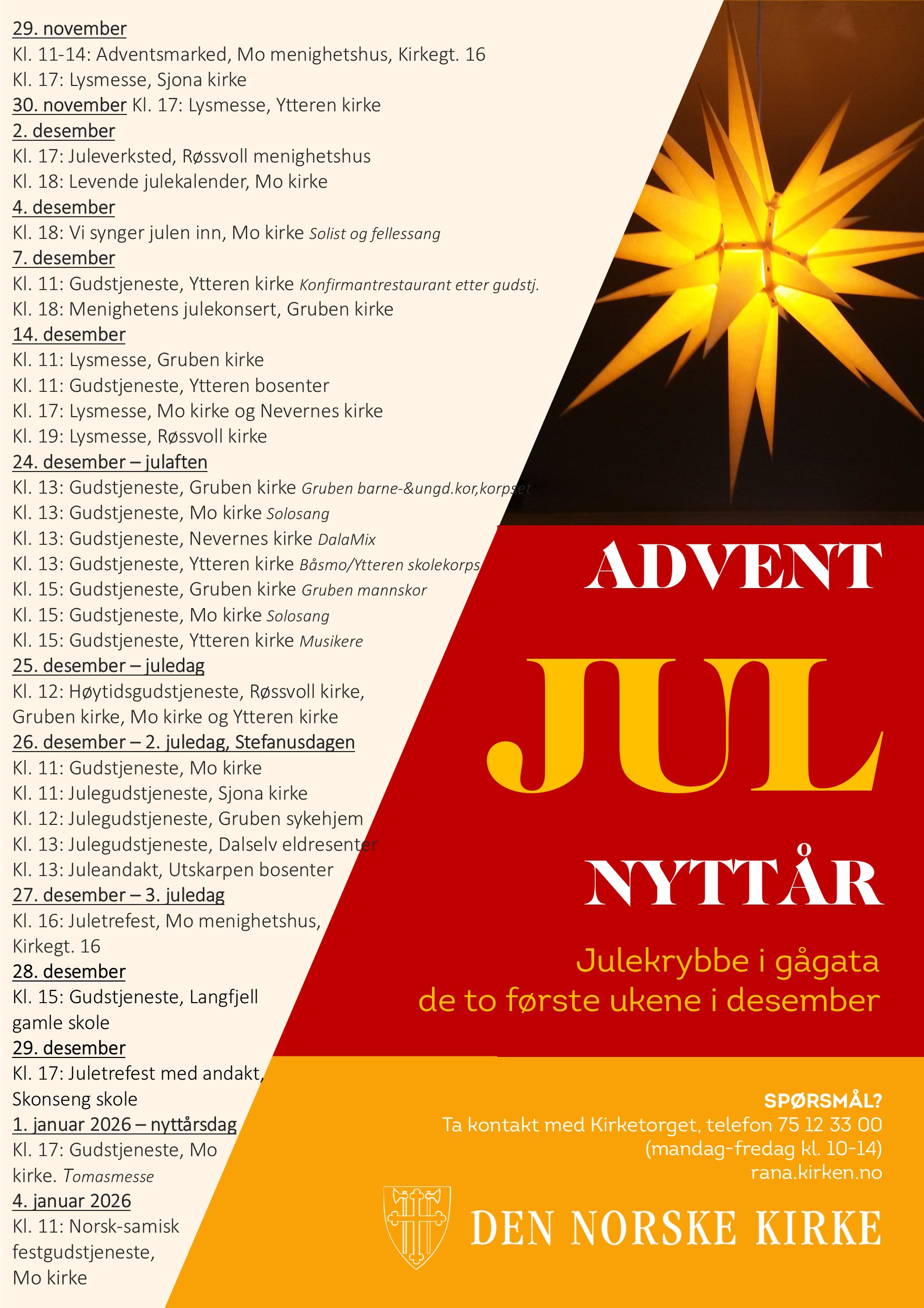 Her finner du en samlet oversikt over det som skjer av gudstjenester og spesielle advents- og juleaktiviterer i Ranas seks kirker i 2025/2026.