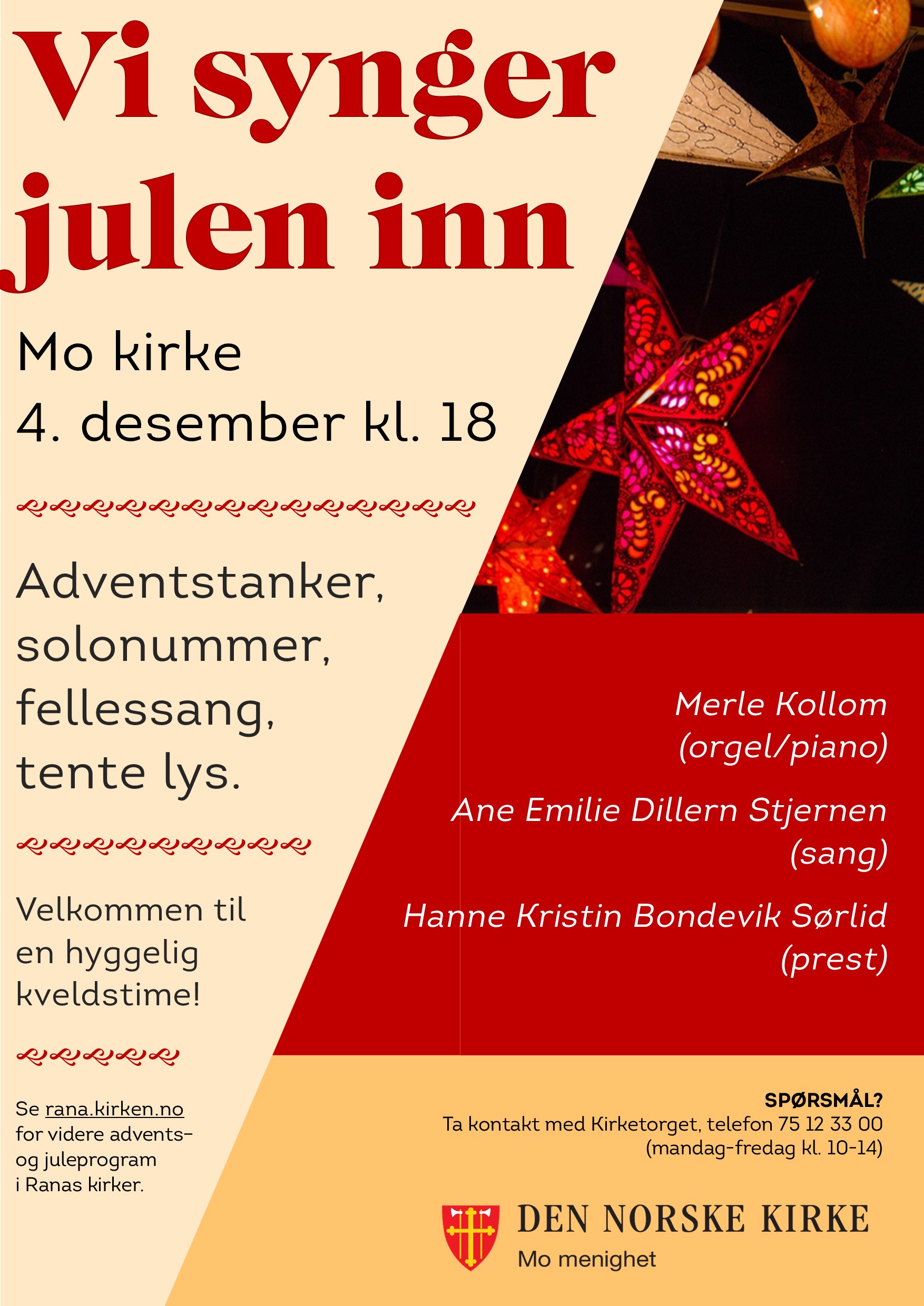 Velkommen til en hyggelig adventskveld i Mo kirke med tente lys, fellessang og solist. 4. desember kl. 18